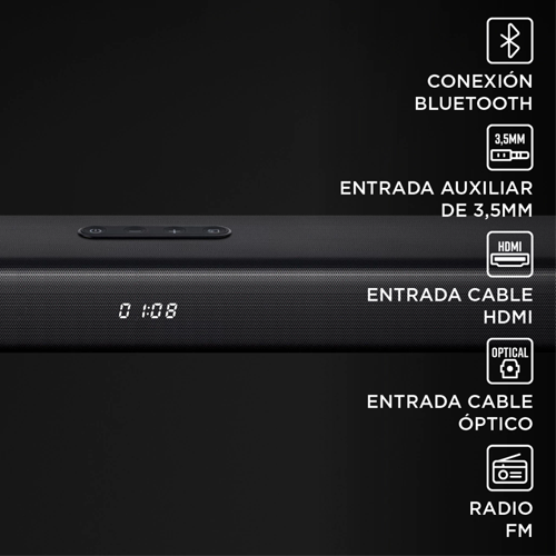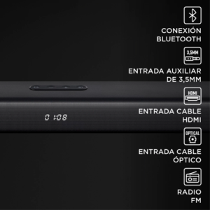 Conectá tus dispositivos fácilmente gracias a sus entradas Bluetooth, HDMI, óptica y AUX, además de radio FM integrada. Compatible con televisores, consolas, celulares y más. - Diseño funcional y elegante