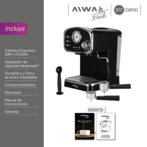 La Cafetera Espresso Aiwa AWK-CE200N combina la elegancia del estilo vintage con la versatilidad moderna. Compatible con café molido y cápsulas Nespresso®, ofrece una preparación personalizada de tus bebidas favoritas