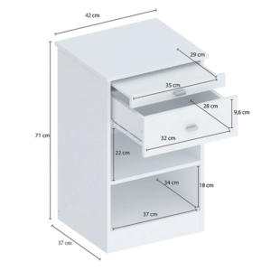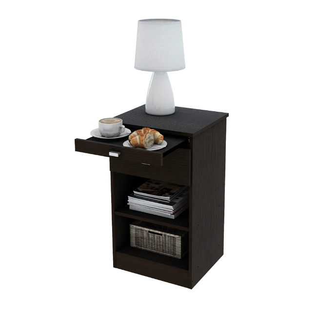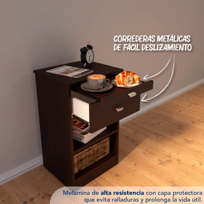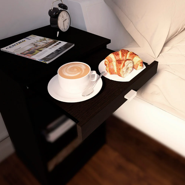 Si sos fan de desayunar en la cama esta es la mesita de luz para vos. Contiene una bandeja corrediza que podes usar para apoyar lo que necesites. Además cuenta con un cajón y un estante regulable en altura para ubicar según tus necesidades.