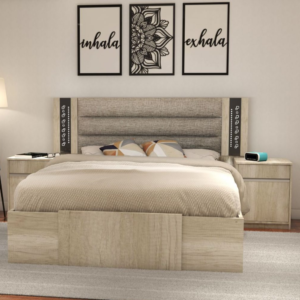 Respaldo de cama, moderno y funcional, extremos con detalle en vidrio de color con micro grabado y luces led. Centro tapizado y acolchado de espuma supersoft. Luces led regulables.