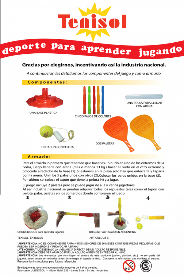 Incluye: 1 base, 1 bolsa para llenar con arena, 5 palos, 1 pelota con tapon y 2 paletas